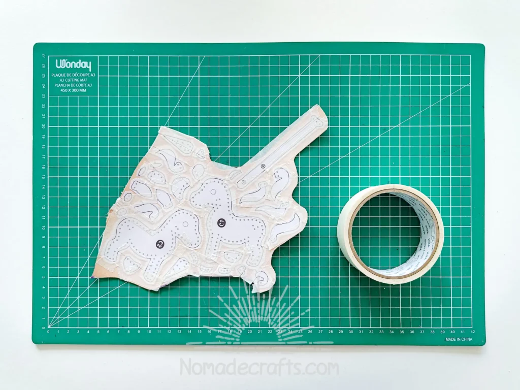 Ritaglia grossolanamente i diversi elementi del disegno e fissali al tuo pezzo di pelle con del nastro adesivo.