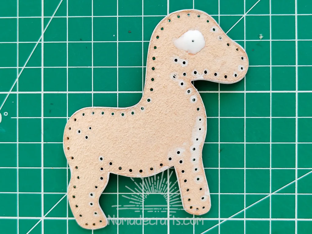 Utilizzare un perforatore da 3 mm per praticare i fori che ospiteranno il rivetto sulla cinghia O-ring (elemento annotato S on the pattern) and a 5mm hole punch for the eyes on both sides of the body (C).